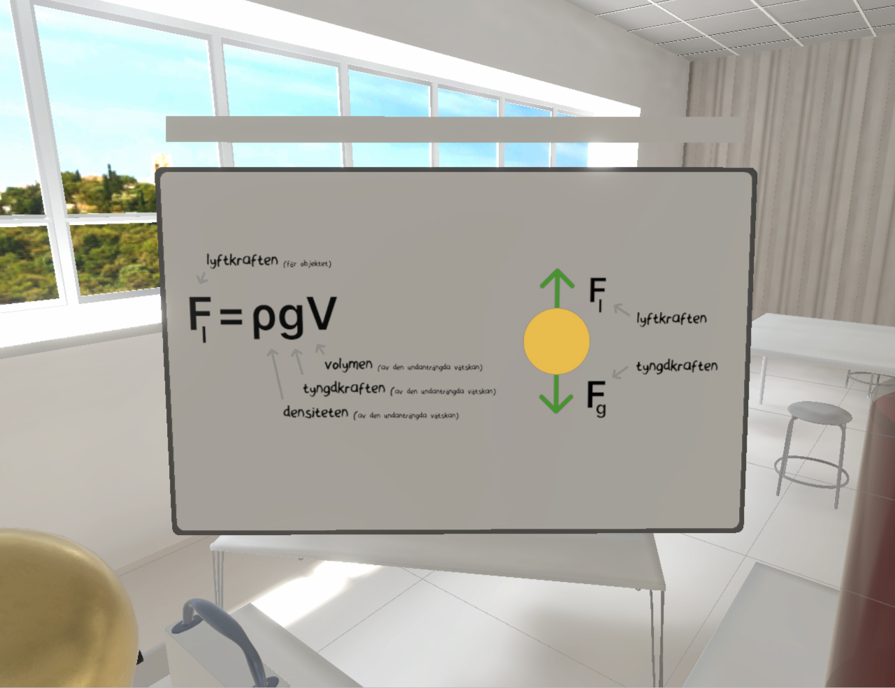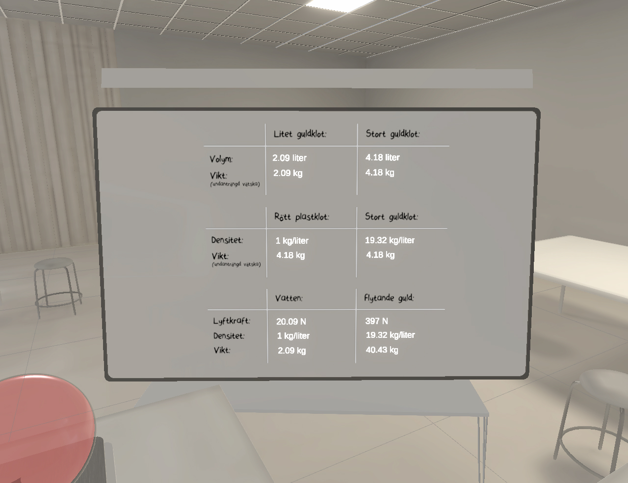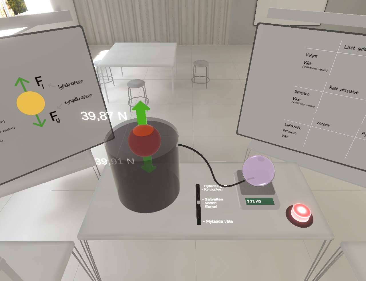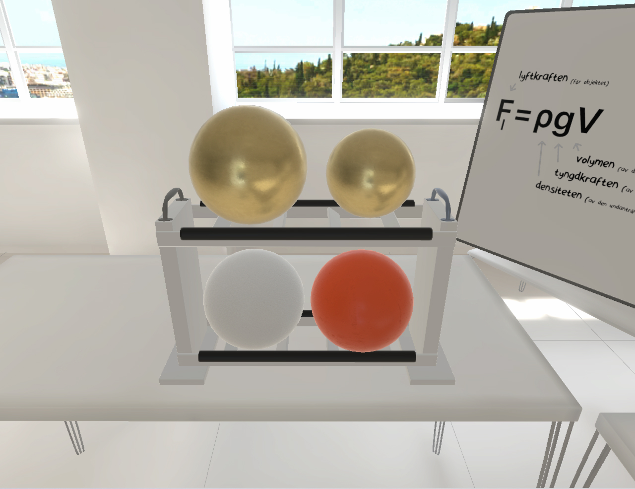 Experimentet innefattar att klot av varierande volym och densitet sänks ner i en bägare fylld med en vätska, som kan varieras. Eleverna observerar hur mycket vätska som undanträngs till ett mätglas, samt väger den undanträngda vätskan. Kraftpilar illusteras på objekten för att visa de dynamiska krafterna som agerar, som varierar beroende på klotets volym och densitet, samt vätskans densitet.